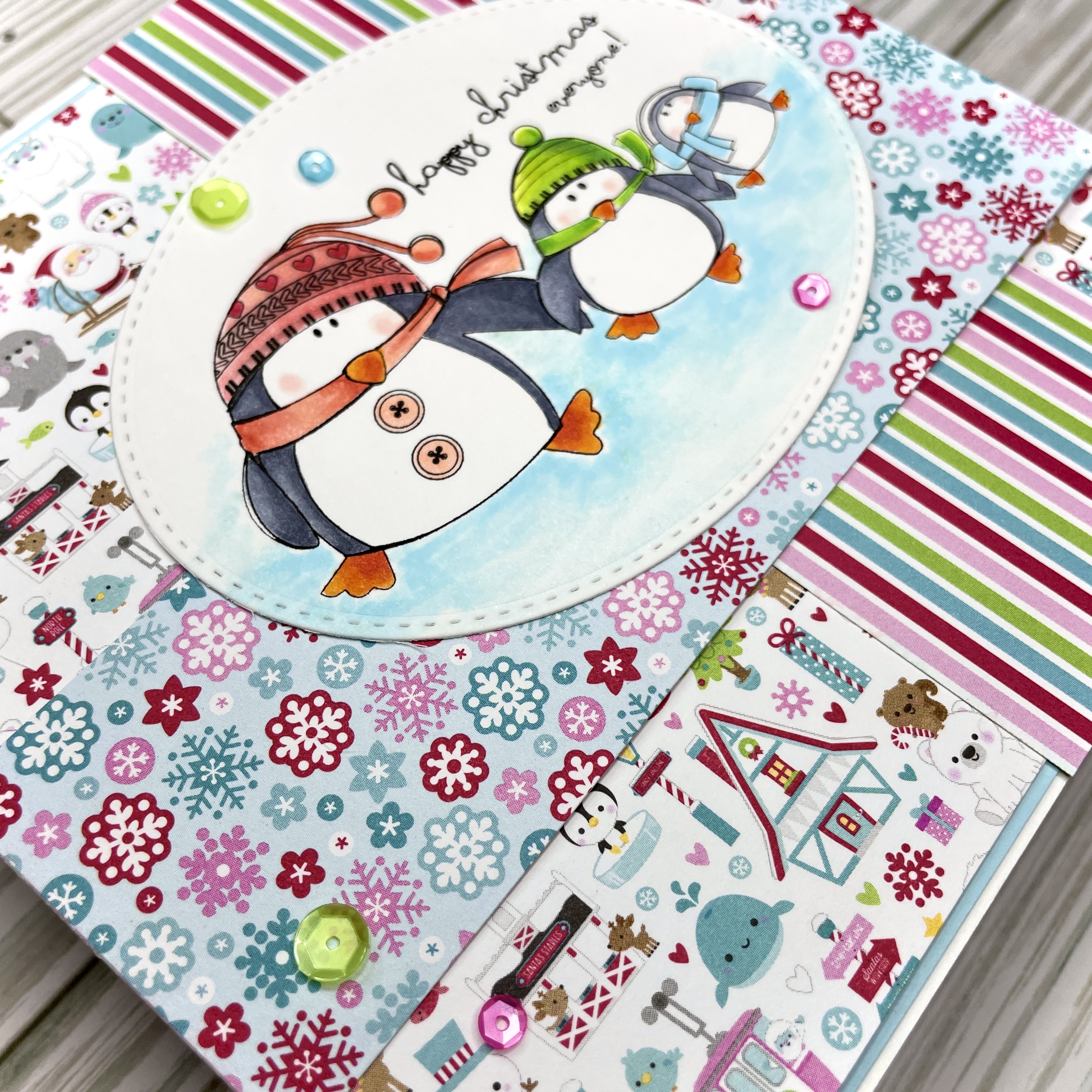 My card features All Dressed Up - Christmas Penguins. I was just unable to resist creating this adorable family of penguins. The image was resized and printed on Neenah Solar White #80 cardstock. I colored the image using Copic markers. A stitched oval die was used to cut the image out. The background was created using various colorful papers from Doodlebug Designs' Let It Snow Collection. To complete the card, sequins were added.
